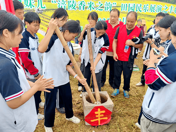 党员教师带领学生亲身参与传统打谷,感受农耕文化的传承与变迁的同时还进行了打糍粑。