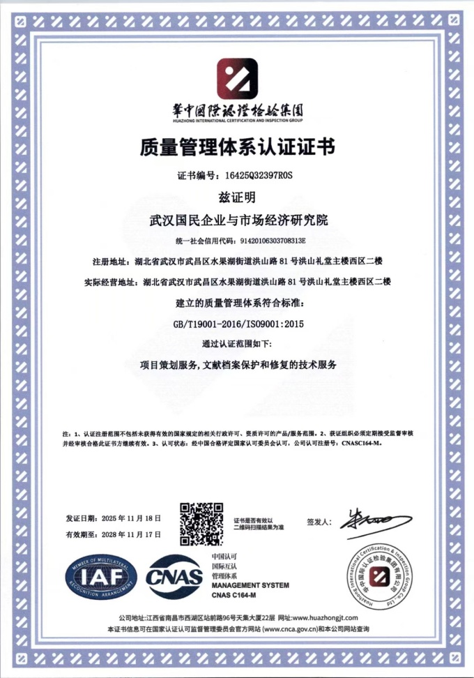 近日,武汉国民企业与市场经济研究院( 以下简称“武研院”)顺利通过质量管理体系(ISO9001)、环境管理体系(ISO14001)及职业健康安全管理体系(ISO45001)的新一轮认证审核。