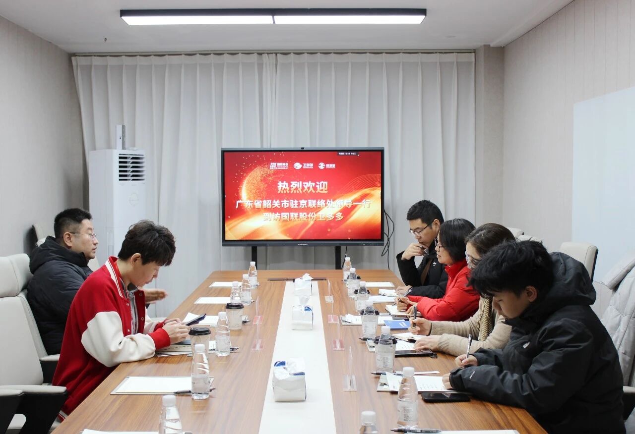 2026年1月12日,广东省韶关市驻京联络处副主任、驻京招商队队长郑湘琳等领导一行到访国联股份卫多多,国联股份产发部副总裁张昊阳等热情接待来访一行,并展开深入交流。