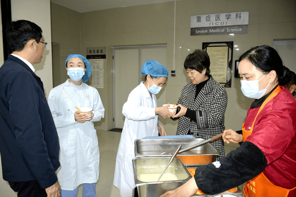 刘培舰院长、秦亚敏主席与刘兵监事一行,先后深入肝胆脾胃科、儿科、糖尿病科、医学检验科、神经外科、妇(产)科、脑病科、肺病科(呼吸与危重症医学科)、肿瘤科、心病科、骨伤科、外科、重症医学科等多个核心科室,将一碗碗饱含深情的汤圆、荷包蛋,逐一递送到护士站、医生办公室、药房及警务室的一线工作人员手中。