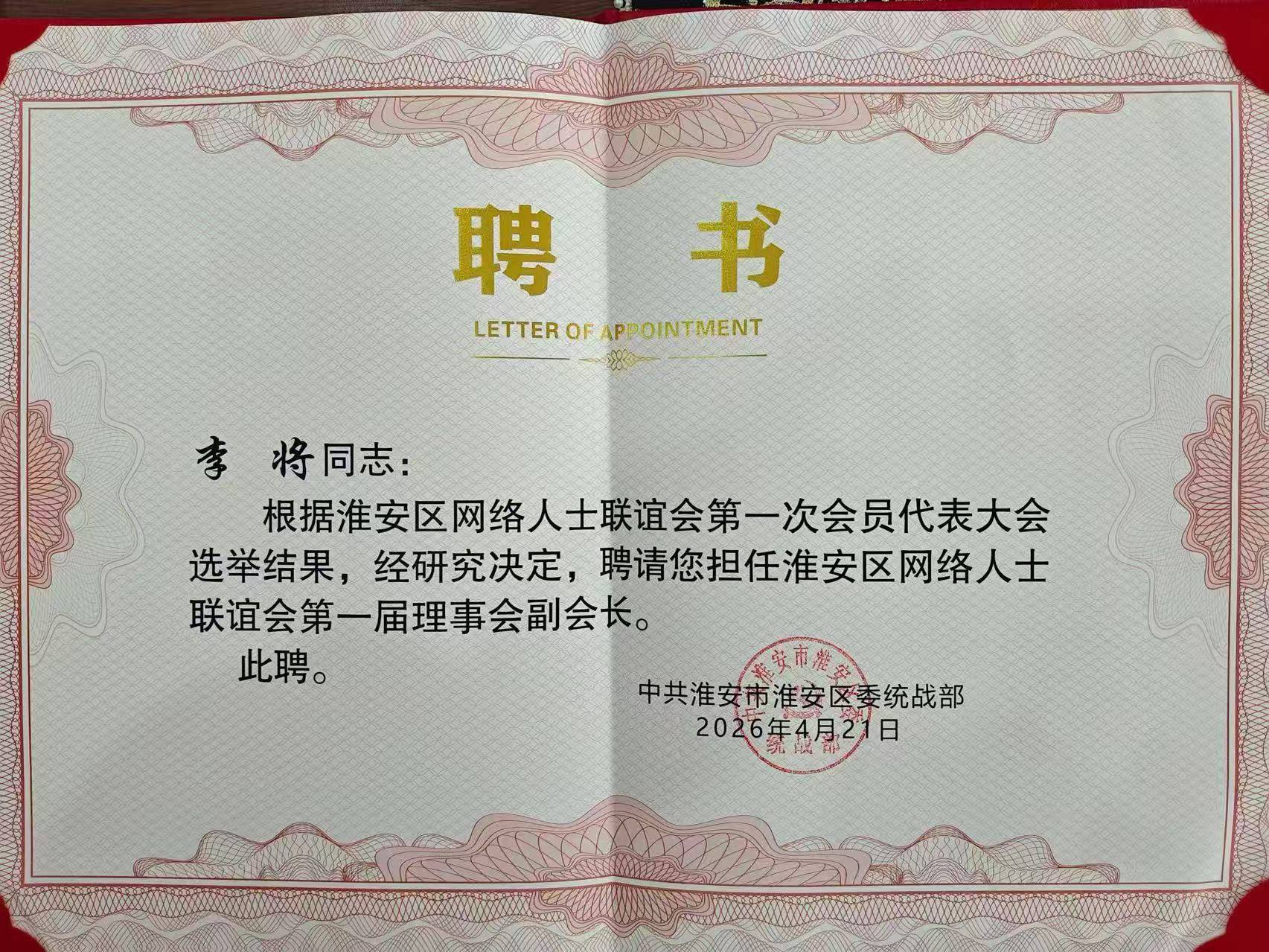 共工新闻网·GNN电(董勇)2026年4月27日,淮安市淮安区网络人士联谊会第一次会员代表大会顺利召开。根据大会选举结果,经中共淮安市淮安区委统战部研究决定,聘请香港共工新闻社江苏代表处副主任、淮安城市网总编辑李将担任淮安市淮安区网络人士联谊会副会长。