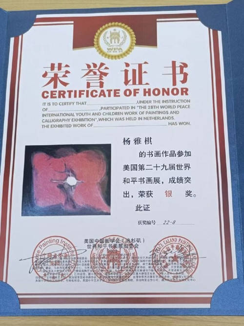 杨雅棋老师作品《爱的精灵》在2023美国第二十九届世界和平书画展名家邀请赛上荣获银奖。