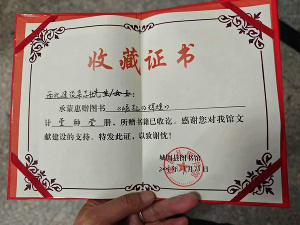 2023年7月28日,由西北建设杂志社出版的大型画册《崛起的辉煌——陕西城市建设20年成果汇编》被汉中市城固县图书馆收藏,该馆馆长刘芳向杂志社颁发了收藏证书,对杂志社的辛勤付出表示感谢,并表示该馆将会精心保存画册,编制索目,便于读者查询、借阅。