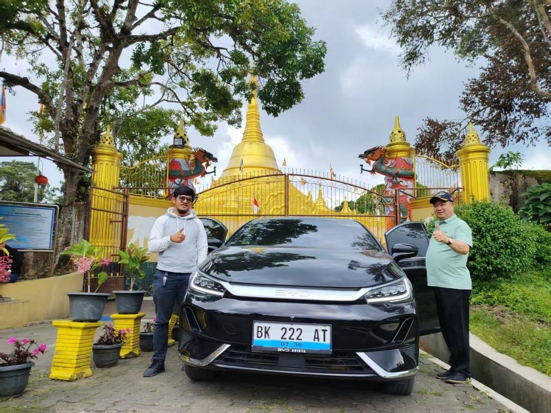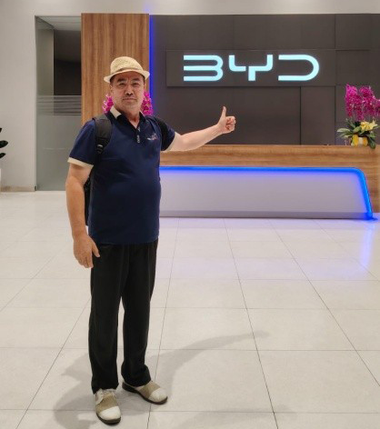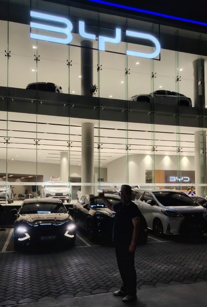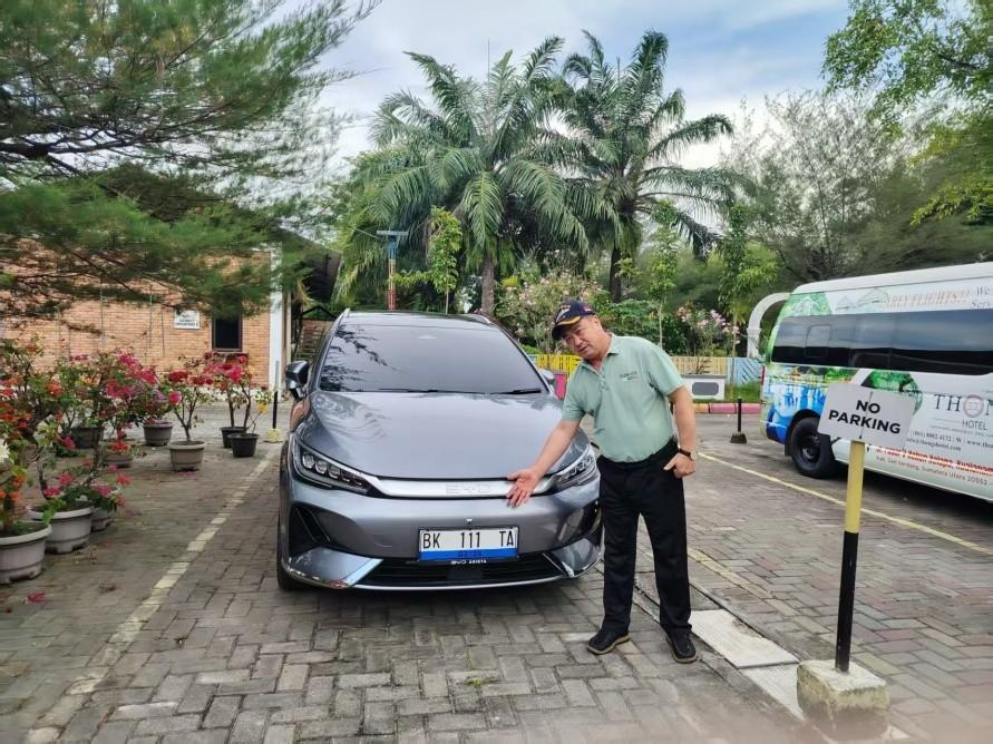 图说:龚全元社长在印尼深空酒店与比亚迪M6新能源汽车合影(车牌BK111TA)。印尼共工社记者 张阿周 摄