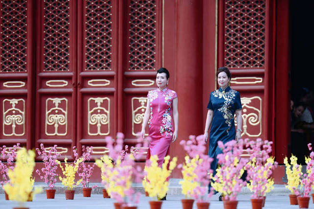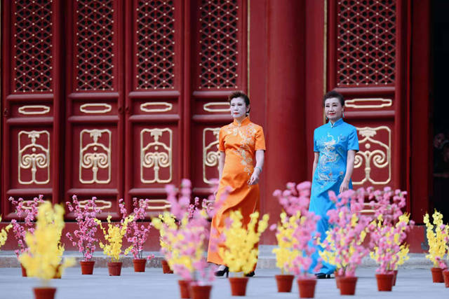 报国寺内,古木参天,殿宇巍然。参与者们身着精心设计的旗袍,步履轻盈,仪态优雅。旗袍上精致的盘扣、细腻的刺绣、流畅的剪裁,无不体现传统手工艺的精湛技艺,与古寺的历史氛围相得益彰,构成一幅流动的东方画卷。