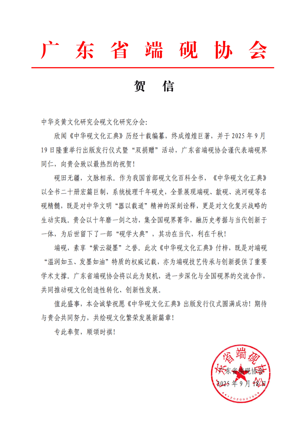 欣闻《中华砚文化汇典》历经十载编纂,终成煌煌巨著,并于2025年9月19日隆重举行出版发行仪式暨“双捐赠”活动,广东省端砚协会谨代表端砚界同仁,向贵会致以最热烈的祝贺!