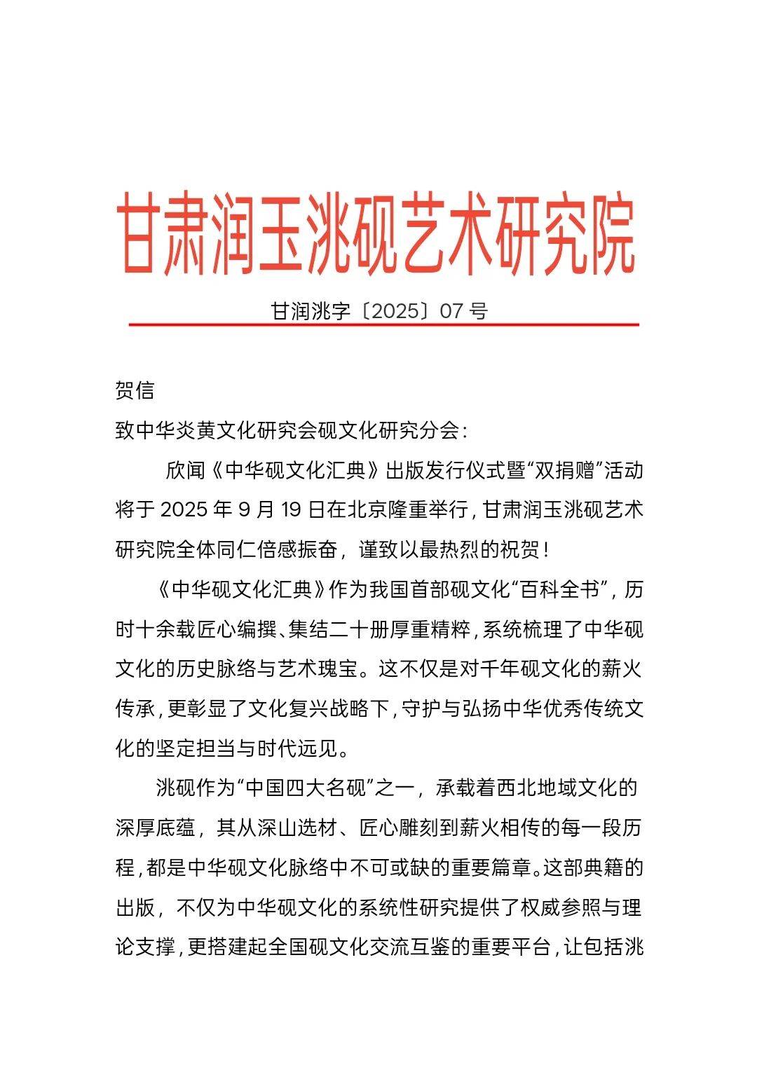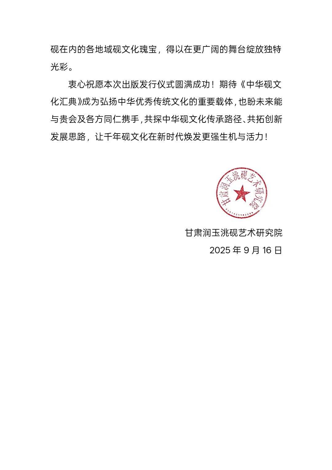 欣闻《中华砚文化汇典》出版发行仪式暨“双捐赠”活动将于2025年9月19日在北京隆重举行,甘肃润玉洮砚艺术研究院全体同仁倍感振奋,谨致以最热烈的祝贺!
