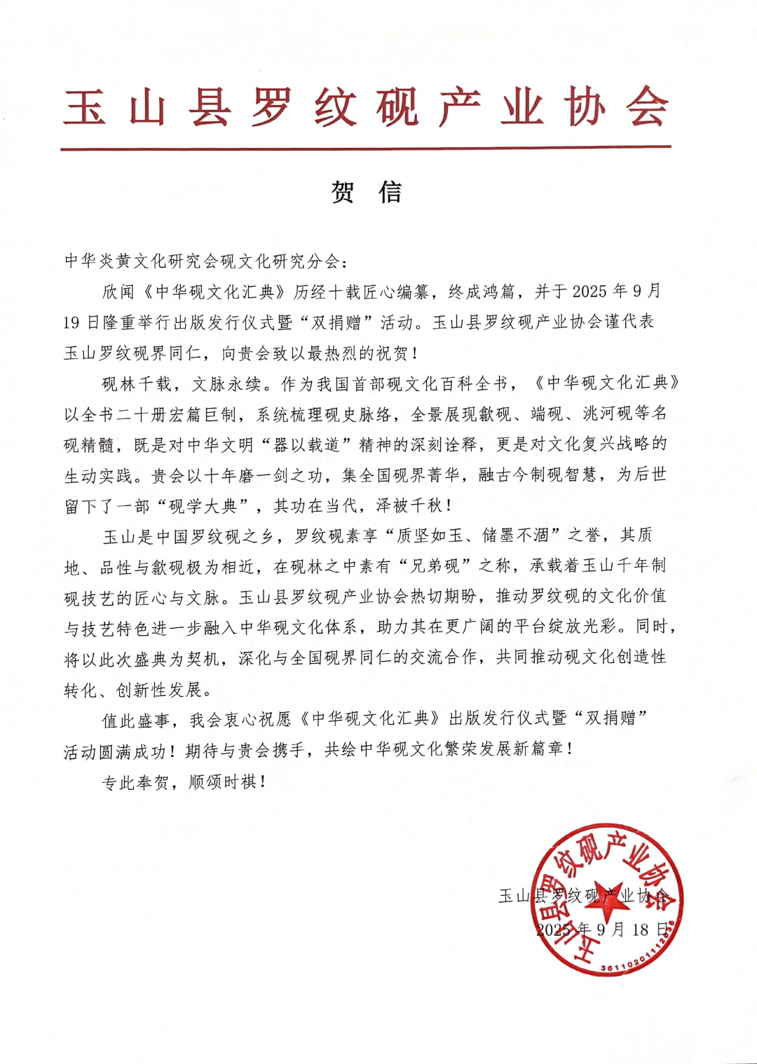 欣闻《中华砚文化汇典》历经十载匠心编纂,终成鸿篇,并于2025年9月19日隆重举行出版发行仪式暨“双捐赠”活动。玉山县罗纹砚产业协会谨代表玉山罗纹砚界同仁,向贵会致以最热烈的祝贺!