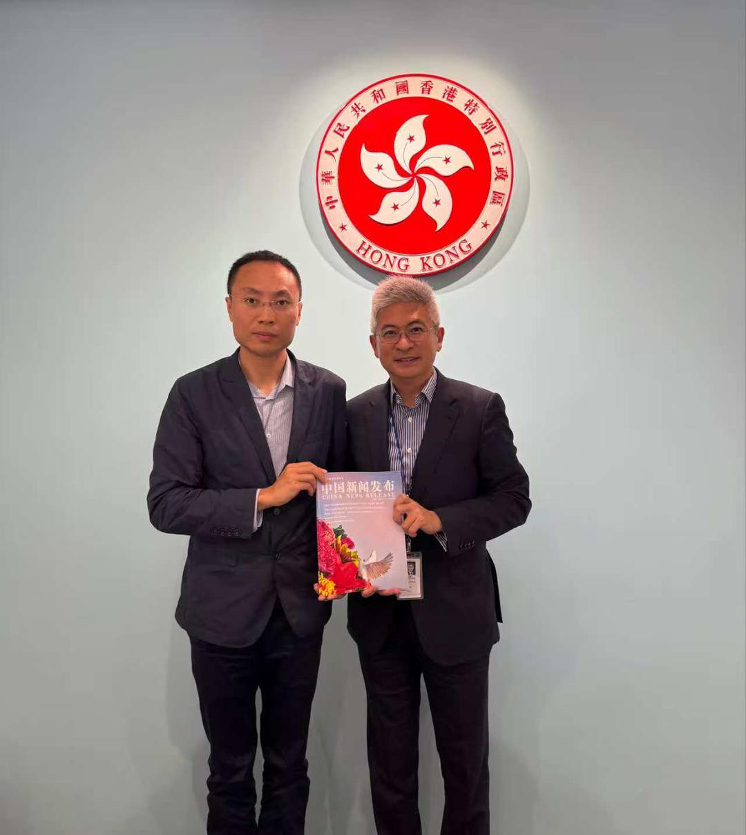 2025年11月6日下午,香港共工新闻社高级新闻顾问、中国新闻发布杂志策划、红刊杂志创始人黄光宇一行在香港特别行政区政府总部大楼向香港特别行政区政府文化体育及旅游局副局长刘震赠送《中国新闻发布》杂志。
