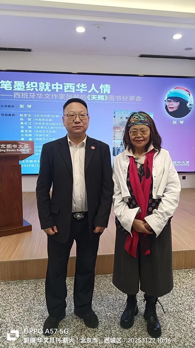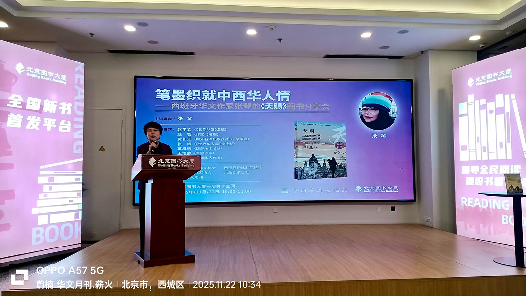 共工新闻社11月27日电(记者 张光) 2025年11月22日,西班牙华文作家张琴携新作《天赐》亮相北京图书大厦,以“跨洋书写中的华人心灵图谱”为主题的分享会温暖开启。共工新闻社文艺部主任蔚楠受邀出席,与文学界同仁及广大读者共同走进这部跨文化视域下的华人故事,感受文字所勾勒的中西交融与海外乡愁。