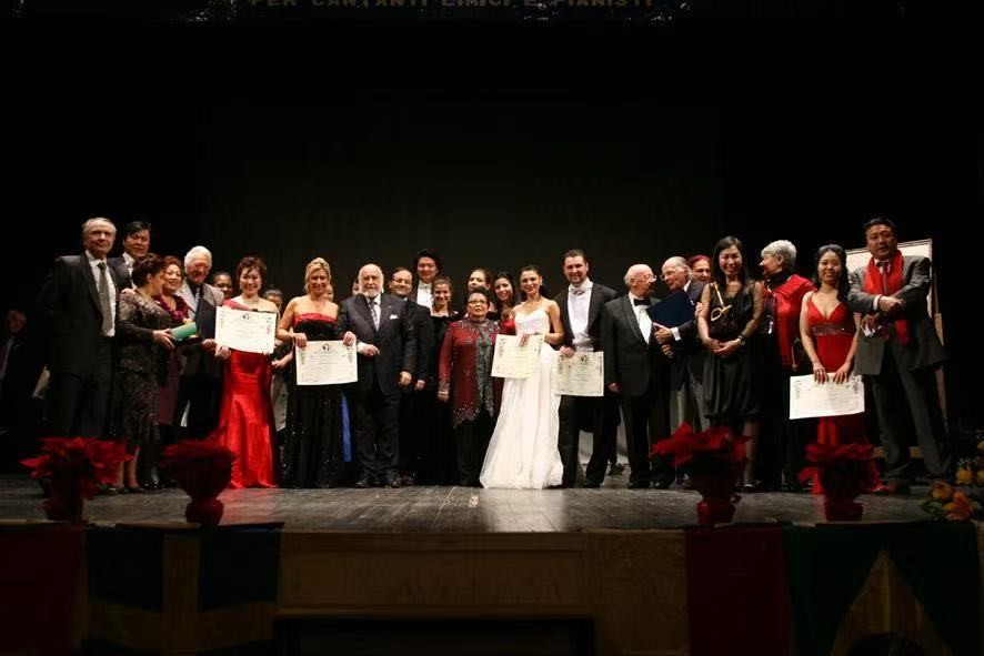 贝利尼国际声乐比赛 2011,左一Francesco Ernani 罗马歌剧院总裁,左三歌唱家刘玉梅评委 ,左四指挥家 Richard Bonynge, 左10, Maestro Giuseppe Pastorello, 右一歌唱家叶曲凌评委,左12 王凯获得第一名。加拿大共工社 发