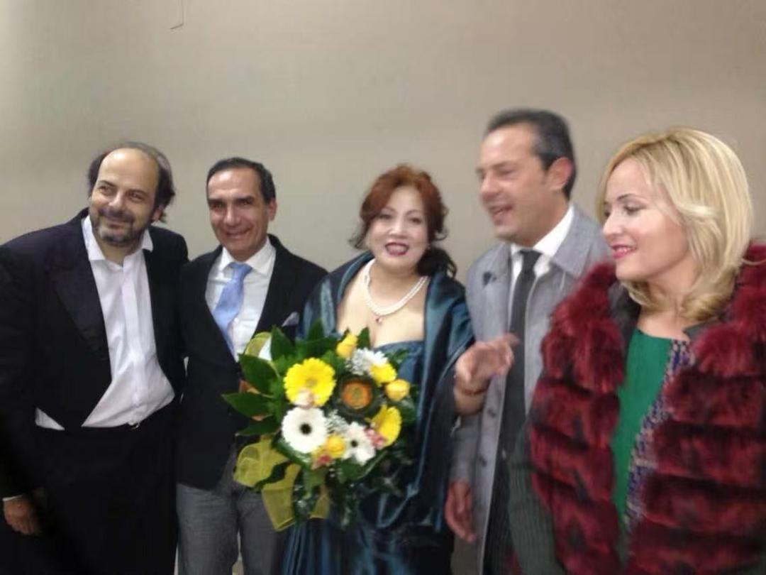 2012 在意大利西西里 “Regina Margherita”剧院音乐会后。左起:莫斯科大剧院男高音 Vladislav Piavko,男高音歌唱家叶曲凌,女高音歌唱家刘玉梅,意大利男高音歌唱家,意大利女中音歌唱家Bruna Baglioni,意大利男高音Giuseppe Pastorello 。加拿大共工社 发