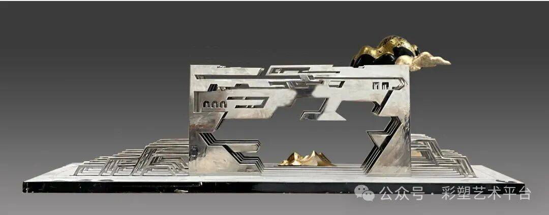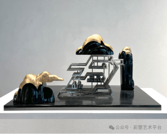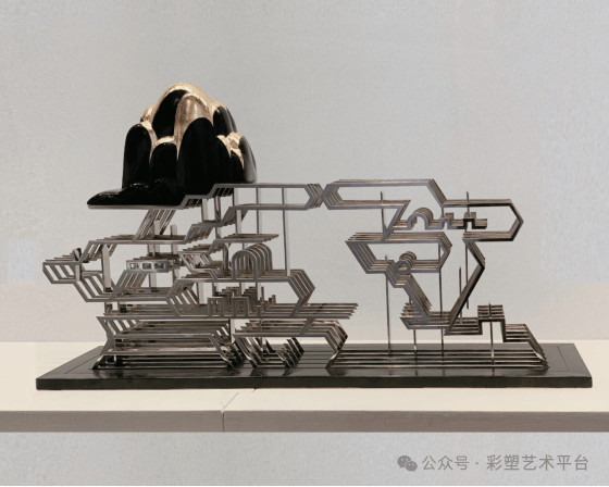 最令我着迷的是作品中对于材料的运用、对比和结合,特别是传统的大漆在雕塑当中的运用。大漆厚重沉郁,不事张扬,它的质感是慢慢渗透出来的,是现实与精神的对话,是人与自然的交流。不锈钢所锻造出利落的线性框架,银亮金属的映射,代表了现代都市的直白冷峻,带着不容置喙的当代气息。每一道折线都透射出工业时代的精准,每一寸反光都书写着科技前行的步伐。