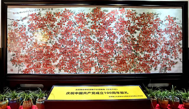 其独标一格的瓷板画“华奎花”系列作品尤具代表性,在《万紫千红》大型瓷板画中,华奎将红花墨叶之韵与高温颜色釉结合,通过窑火的自然变化,使色彩产生微妙丰富的层次感,既有传统写意绘画的笔墨韵味,又有现代材质的肌理美感。画面上的题诗书法、压角印章与绘画主体浑然一体,形成多维度的艺术表达。这种跨界融合并非简单的形式叠加,而是基于对中国艺术精神深刻理解的内在整合。《万紫千红》是一幅尺寸为5米×2米的釉中彩瓷板画,于2021年在景德镇创作完成,旨在献礼中国共产党成立100周年。该作品历时半年,历经三次烧制,其中两块在烧制过程中破损,最终第三块成功完成。作为目前已知尺寸最大的釉中彩瓷板画,其市场估价达一亿两千万元。2021年,该作品在景德镇国际陶瓷博览会上展出,引起广泛关注,现陈列于北京三礼堂陶瓷艺术馆。