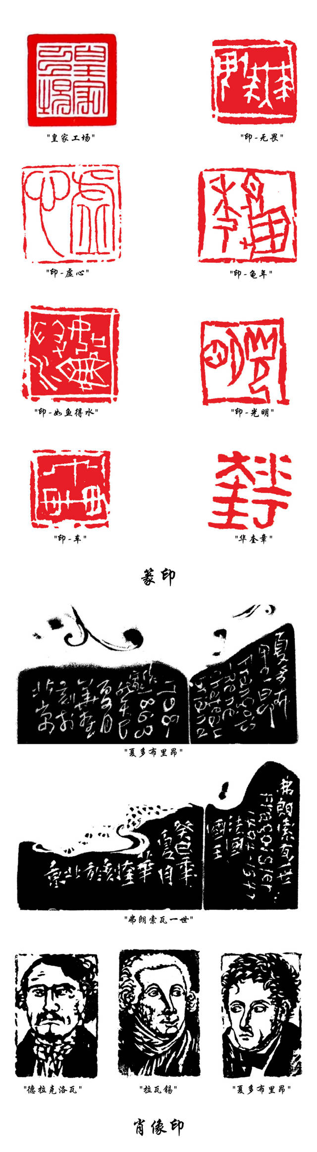 华奎先生的篆刻不仅是技艺的展示,更是学养的体现。他深研古文字学,对金文、小篆、汉隶皆有心得,故其印文无论朱白,皆有来历又自出新意。如他的代表作肖像印系列,布局疏密有致,线条刚柔相济,将老庄哲学的深邃意蕴凝结于方寸之间。当这方印钤于画作之上,红色的印迹不仅平衡了画面构图,更赋予作品以"金石永固"的文化象征意义。