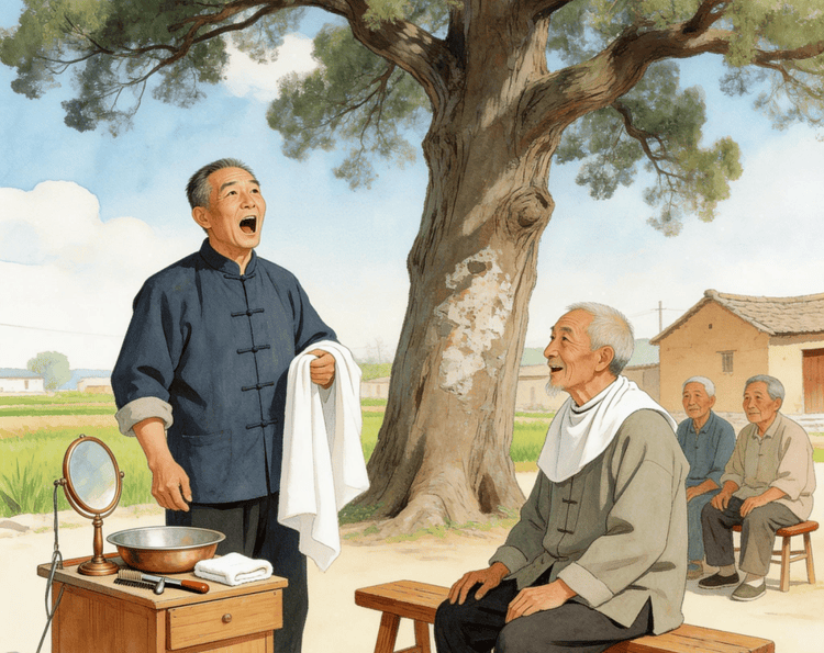 吴师傅剃头颇有仪式感。每隔十天半月,他便来到村里那棵古柏树下,一边吆喝“剃头喽”,一边支起摊子。村里老少爷们听到那熟悉的声音,便迅速围拢过来。于是,在充满欢声笑语的树荫下,大家开始轮流剃头。