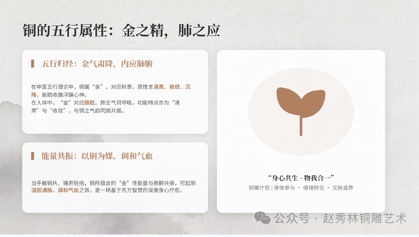 一锤入魂,万般皆愈。赵秀林铜雕疗愈,以非遗技艺为载体,深挖铜的五行金行特质,把它温阳调和的力量,藏在每一次挥锤、每一次刻画里。每一次与铜的触碰,每一次清脆的锤鸣,都是一场五行滋养与身心对话的过程,愿你能在这里,卸下疲惫,重获内心安宁,实现身心同频。