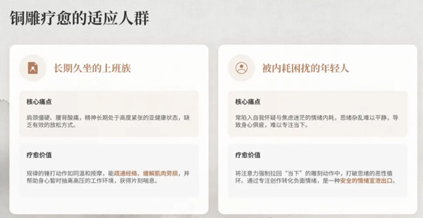 铜雕疗愈没有专业门槛,不管是长期久坐、肩颈僵硬酸痛的上班族,被内耗缠上、常常焦虑迷茫的年轻人,还是想沉淀心性、缓解生活压力的中老年人,甚至是需要锻炼专注力的青少年,都能从中获得滋养。除此之外,它也能作为抑郁症、焦虑症等精神疾病的辅助疗愈方式,为患者提供一个安全的情绪宣泄出口。我们希望通过这种方式,帮每一位体验者走出浮躁内耗,找回内心的从容与平和,也为精神疾病患者的康复之路,添一份温暖的力量。